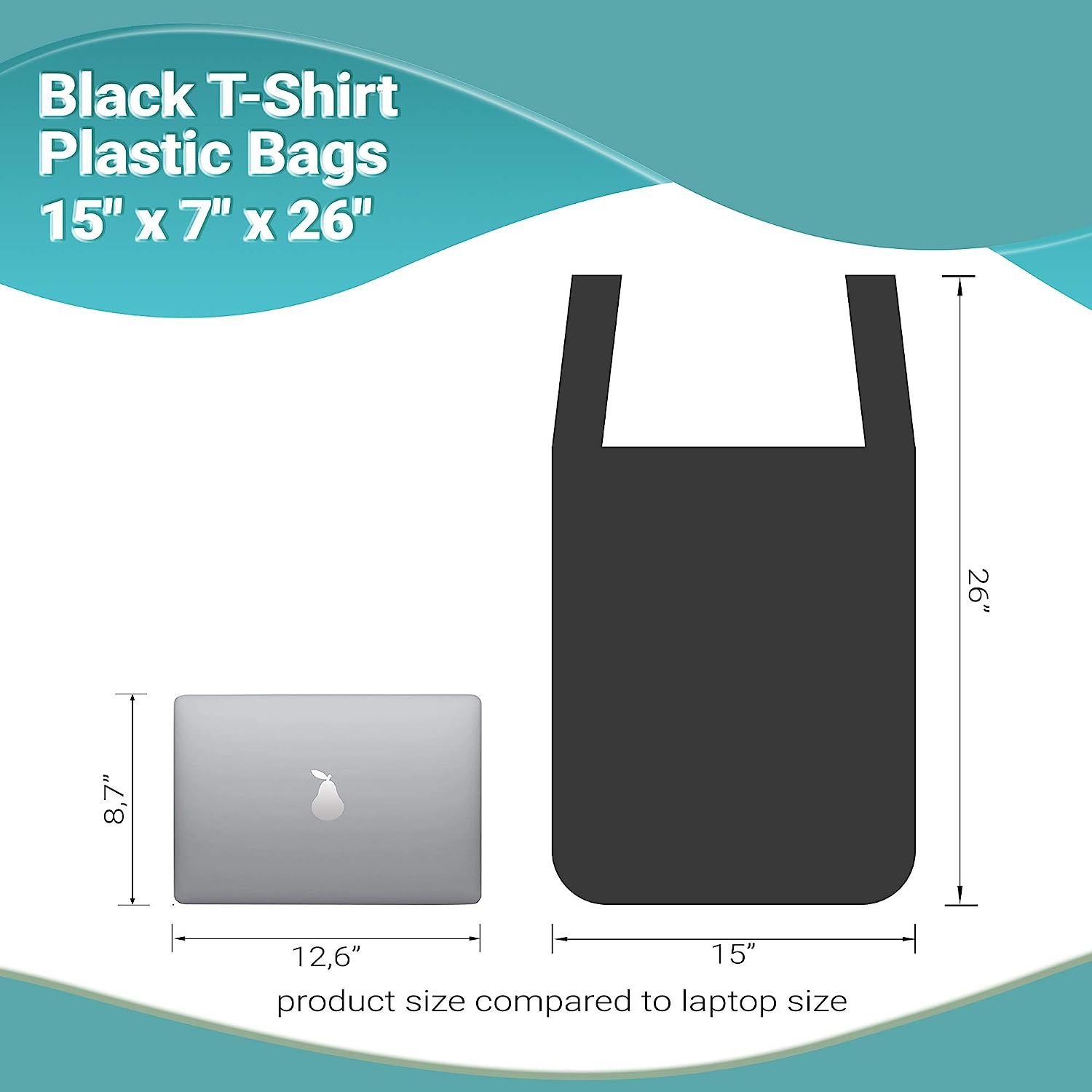 Pack of 500 Black Plastic Bags 15 x 7 x 26. Plain Carry-Out T-Shirt Bags 15x7x26. Thickness 0.65 mil. Unprinted Shopping Bags. Handled Polyethylene Ba