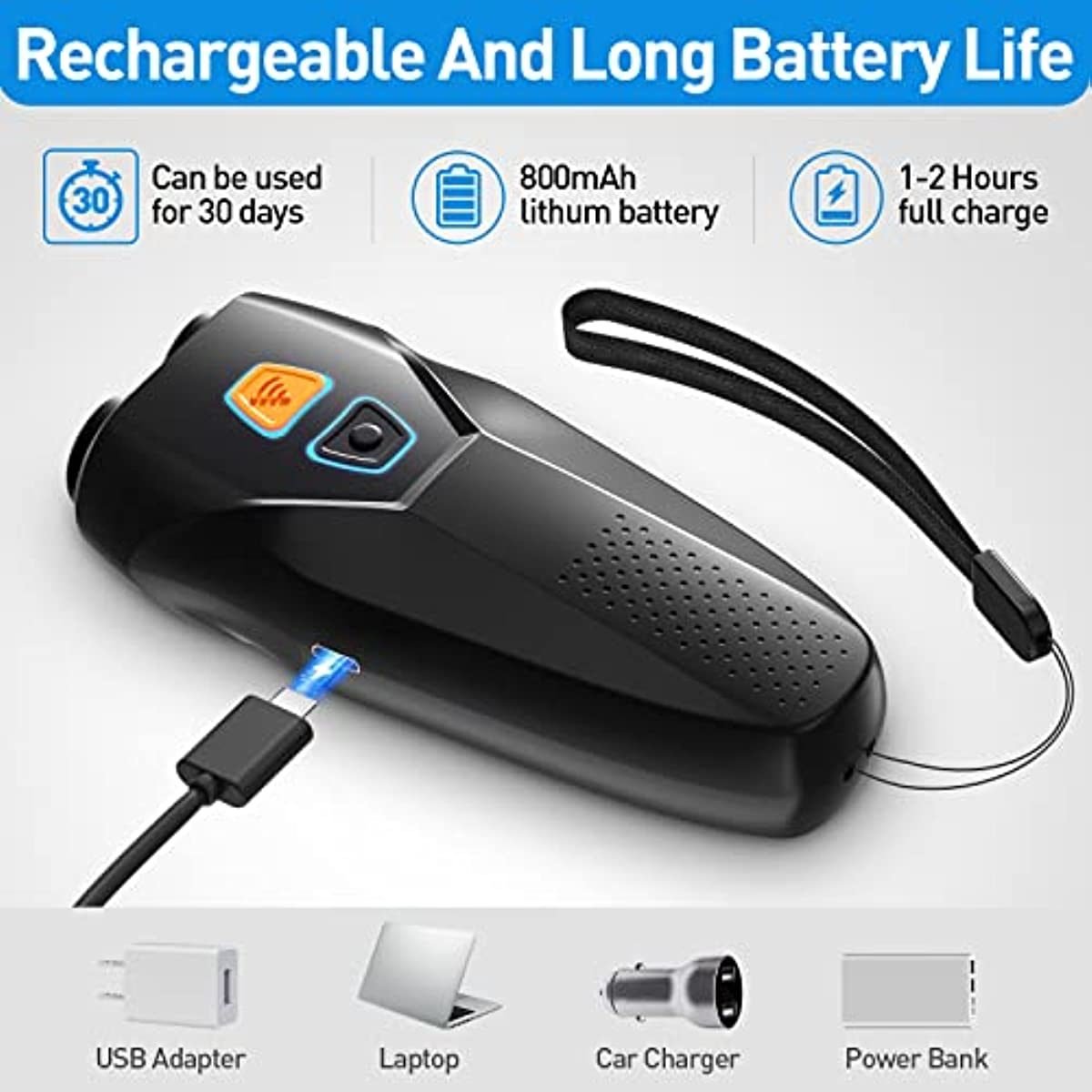 Safe and efficient dog training & behavior aids: dog barking control devices emits an ultrasound of 20~25 KHZ; which exceeds the range of human hearing but can easily lead to the dog's attention without hurting your dog like a dog whistle; safe to correct unwanted behavior and stop dog barking or prevent eating unsafe food; effective pet corrector for dogs of all types and sizes of age 6 months to 8 years old sonar heads up to 25ft range effect : this anti barking device with dual heads has higher power and more effective than the single head on the market; this electronic dog whistle equips with 800mah rechargeable battery; provide full charge in 1 to 2 hours for about 30 days of regular use Two modes with flashlight ultrasonic dog whistle to stop barking ; Deterrent mode:emit a higher intensity ultrasonic sound while the flashlight flashes to drive the fierce dog away; Training mode: emit a lower intensity ultrasonic sound to assist in daily dog training such as stop excessive barking; fighting; biting; and correct other unwanted behaviors; the flashlight also has a long-bright mode for walking your dog at night Slim design with anti-mistake lock key: this dog barking deterrent devices is slimmer that make it is better fit even in a smaller hand; the independent and clear keys make it easy to use; the anti-mistake lock key will avoid false triggers; also come with a adjustable wrist strap for use outdoor Button pressing with vibration effect : when pressing the button of this ultrasonic dog bark deterrent devices; it will also have a vibration effect; which will bring you a better experience ; and the button light indicator will be red in low power