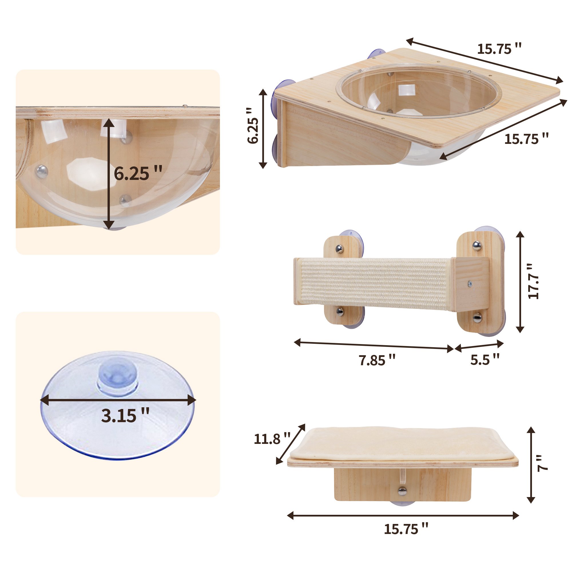 The size of the cat diving platform is 40 (L) * 30 (W) * 18 (H) cm, supported by 3 suction cups, and the plush cloth pad on the platform is connected with Velcro;