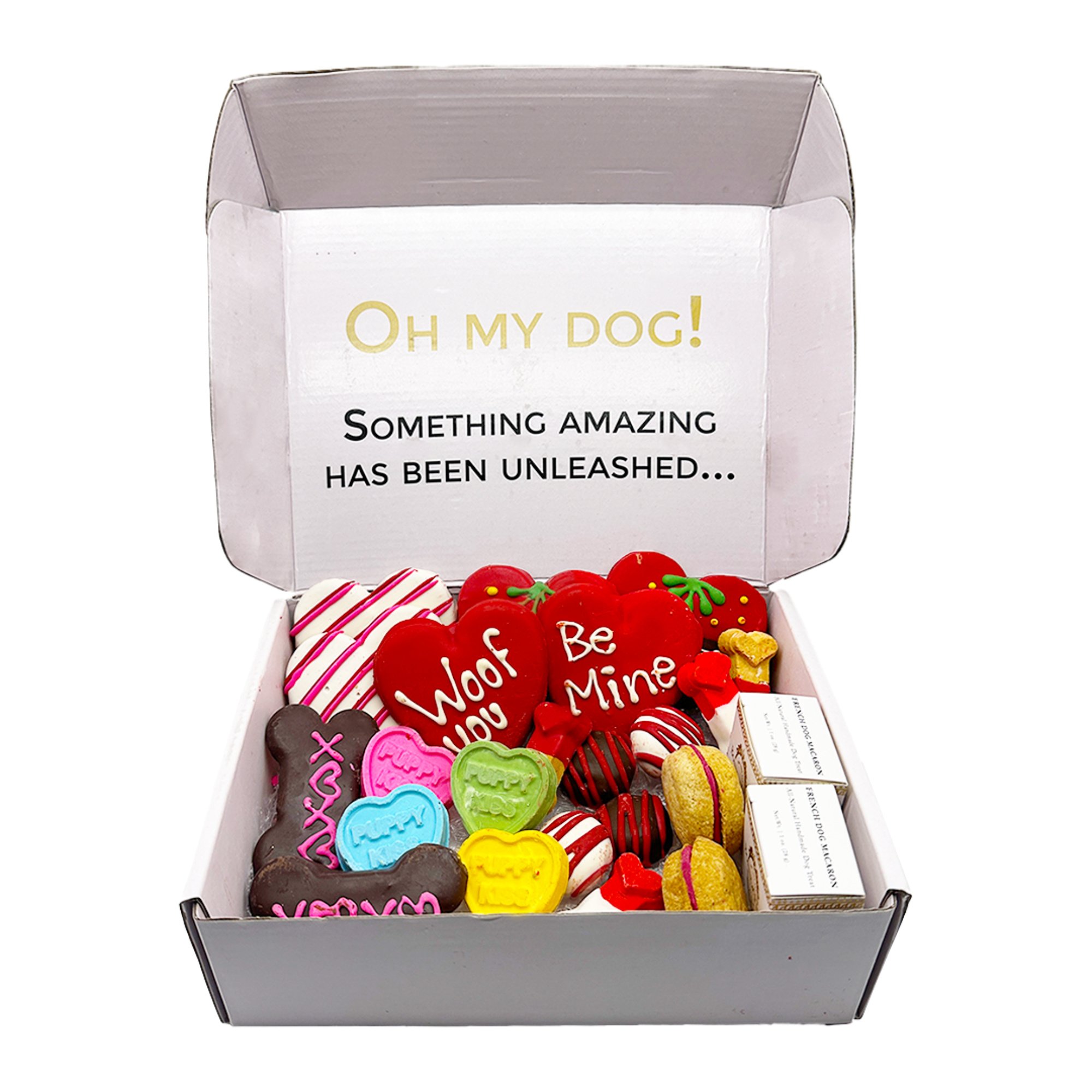 - Includes 22 themed treats including various sized hearts, dog bones, macarons, and truffles, etc.