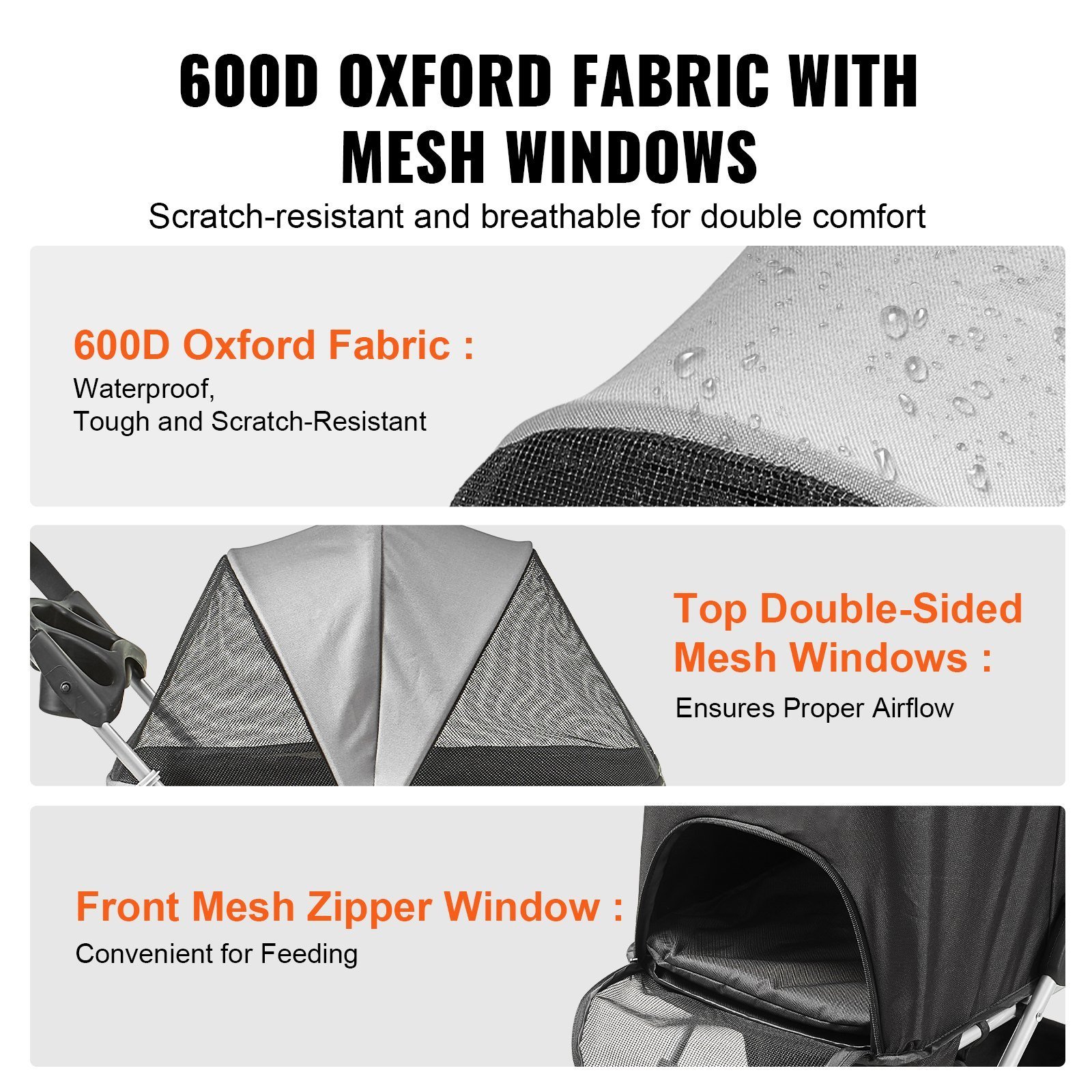 3.600D Oxford Fabric and Mesh Windows: The sturdy 600D Oxford fabric can withstand pet nibbling, keeping the cat stroller in pristine condition. Multiple breathable mesh windows ensure unhindered airflow, providing your pet with a wide field of vision. The spacious carriage basket adds to your pet's comfort.