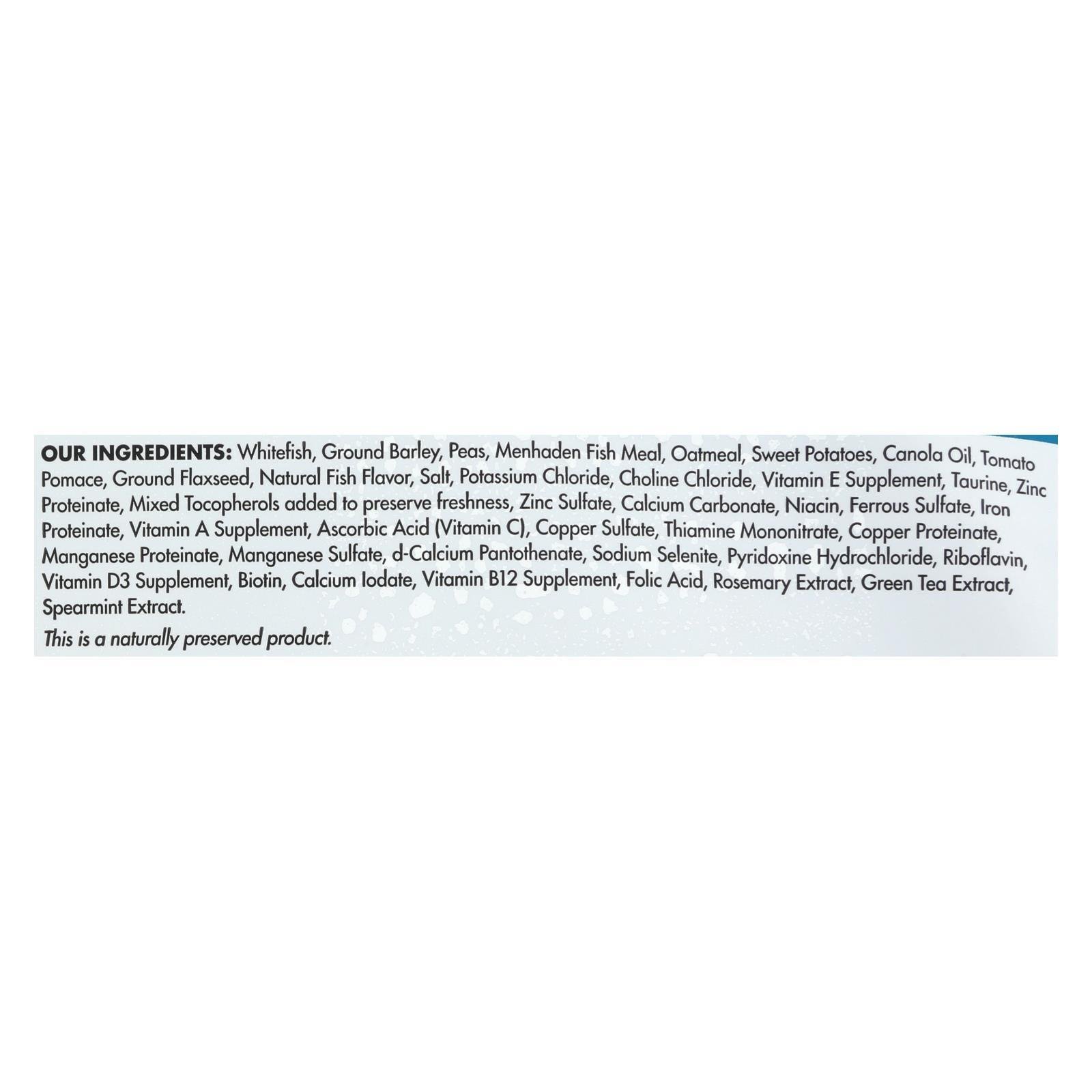 ingredients : whitefish;ground barley;peas;menhaden fish meal;oatmeal;sweet potatoes;canola oil;tomato pomace;ground flaxseed;natural fish flavor;salt;potassium chloride;choline chloride;vitamin e supplement;taurine;zinc proteinate;mixed tocopherols added to preserve freshness;zinc sulfate;calcium carbonate;niacin;ferrous sulfate;iron proteinate;vitamin a supplement;ascorbic acid;vitamin c;copper sulfate;thiamine mononitrate;copper proteinate;manganese proteinate;manganese sulfate;d-calcium pantothenate;sodiu